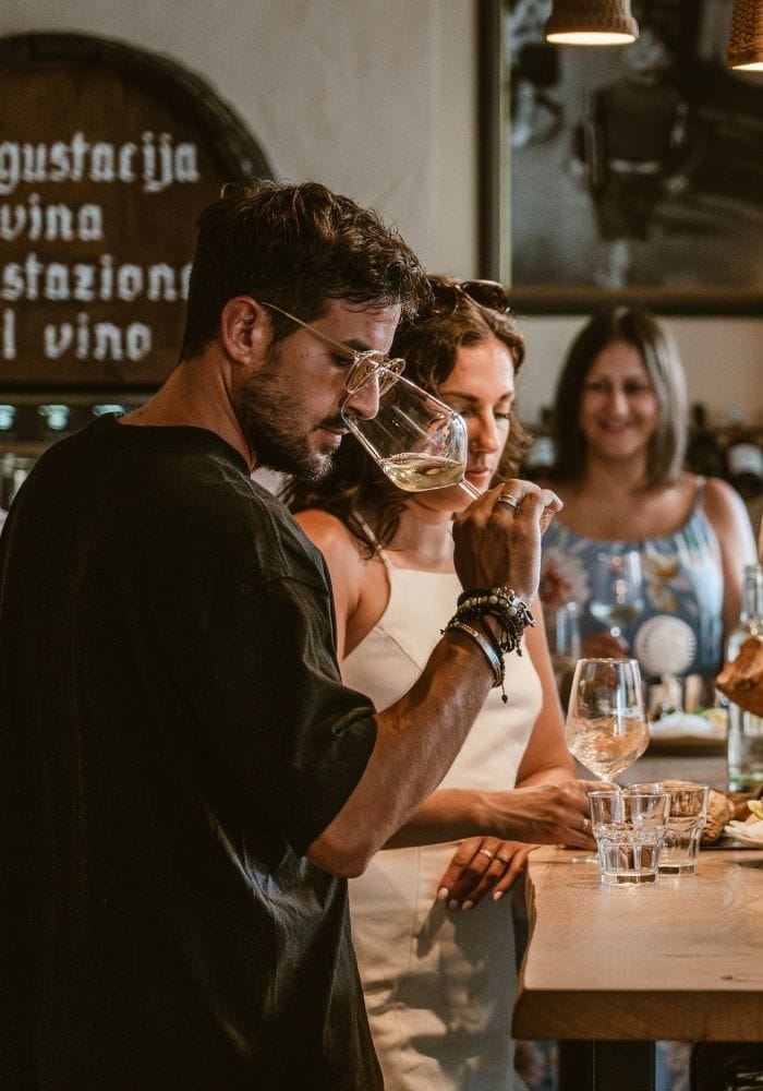 Gli ospiti possono scegliere tra prodotti locali selezionati, come oli d’oliva, tartufi, sali aromatizzati e cioccolatini, e degustare vini catturati in moderni dispositivi di degustazione, seduti a un enorme tavolo fatto a mano o vicino alle finestre aperte che si affacciano sulle pittoresche stradine di Pirano.